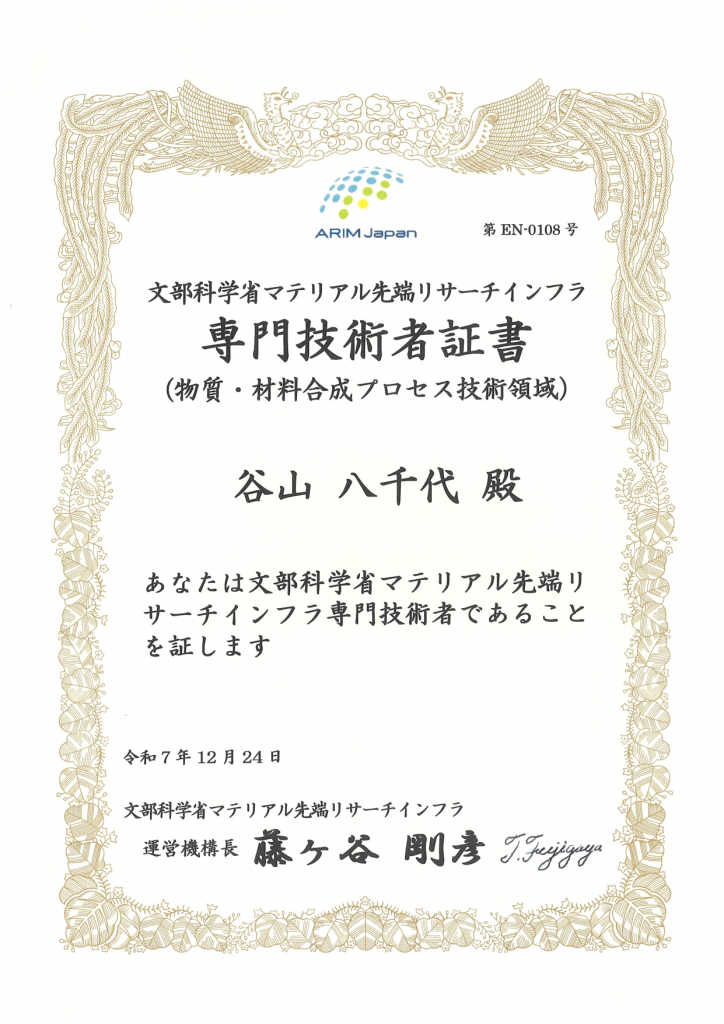文部科学省マテリアル先端リサーチインフラ(ARIM Japan)事業において,審査の結果,高度専門技術者(物質・材料合成プロセス技術領域)と認定された